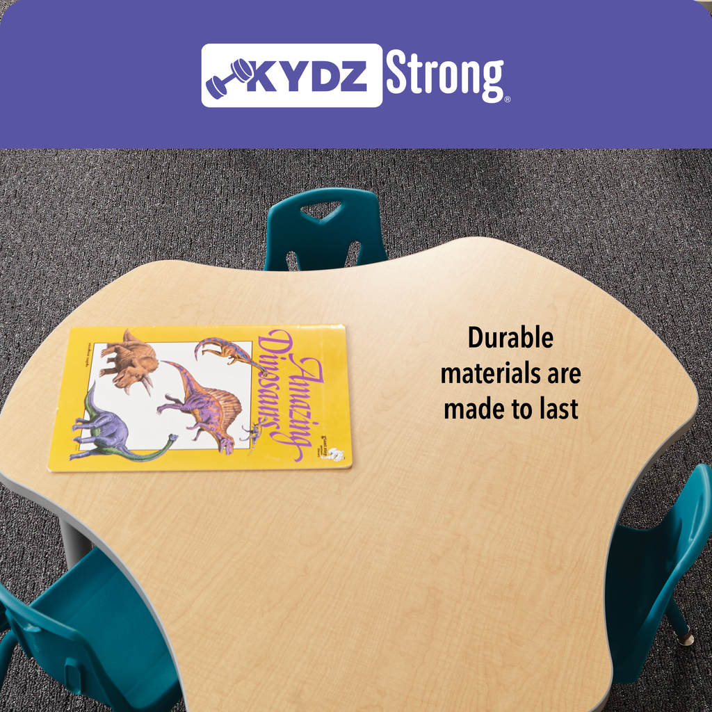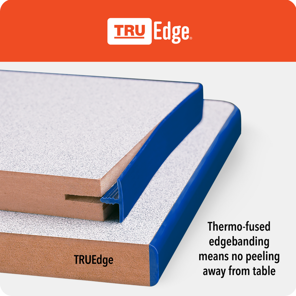 KYDZSafe edges. KYDZStrong construction. TRUEdge. Choose from multiple tabletop and TRUEdge color combinations. Thermally Fused Laminate tabletops 1-1/8” thick. Quick mount legs with . Legs adjust in one-inch increments with the extra-safe dual-screw leg adjustability system. Helpful Hint: Most children require elementary size tables – tiny tables typically fit children just 1 to 2 years old. Adjusts from 15" to 24" high.