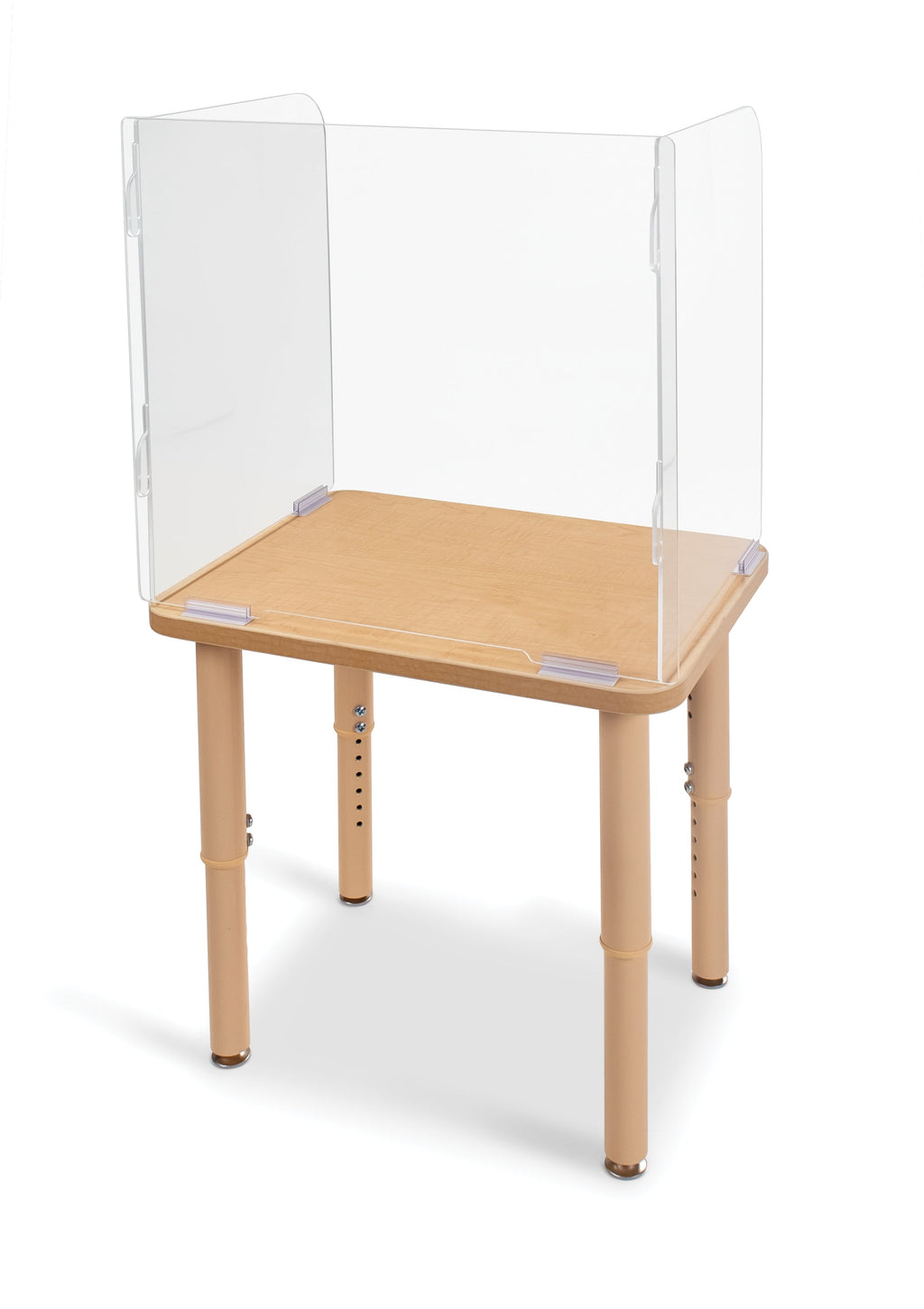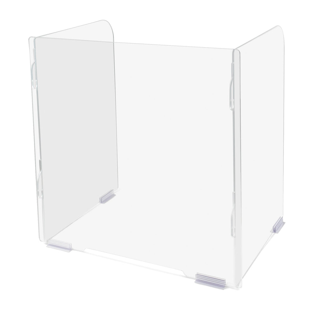 Keep students and employees protected with this Desktop Shield. The three sides of see-thru acrylic provide maximum safety and visibility and the 24” height is perfect for taller students or adults. The front panel features an 11” wide x .5” high opening at the bottom to slide papers and other small items back and forth. The hook cutouts on the side panels easily slide into slots on the front panel for quick assembly and the included four fasteners have adhesive bottoms to keep shields in place and prevent them from sliding. The side panels can be splayed out to the sides to an opening of approximately 27?" to give children more room if desired. No tools needed for assembly. Fasteners are not reusable and additional fasteners can be purchased separately. Warning - Adult Assembly Required.
