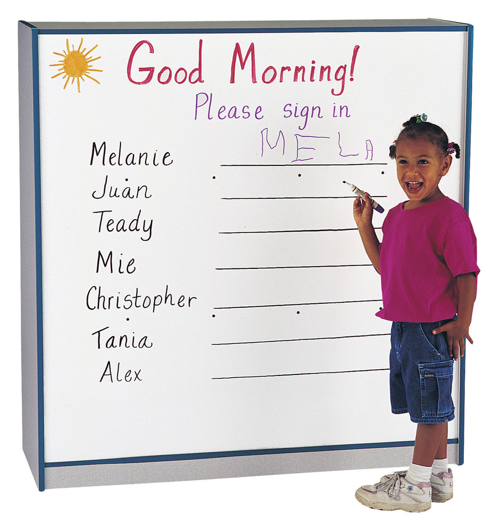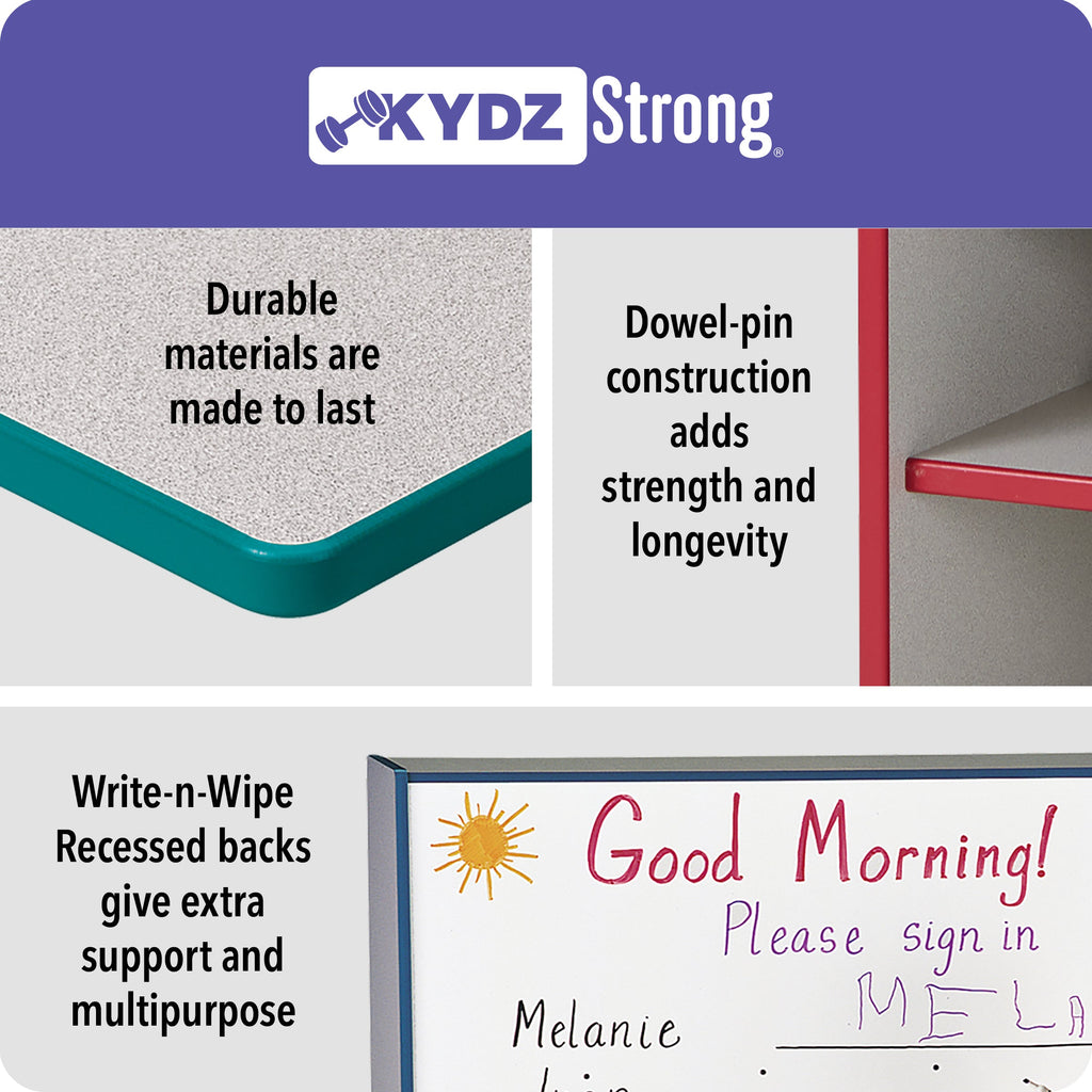 KYDZSafe edges. KYDZStrong construction. TRUEdge. Constructed of 5/8” thick freckled-gray Thermally Fused Laminate (TFL). Standard Write-n-Wipe recessed backs. Back options available. Double coat hooks. Stationary.